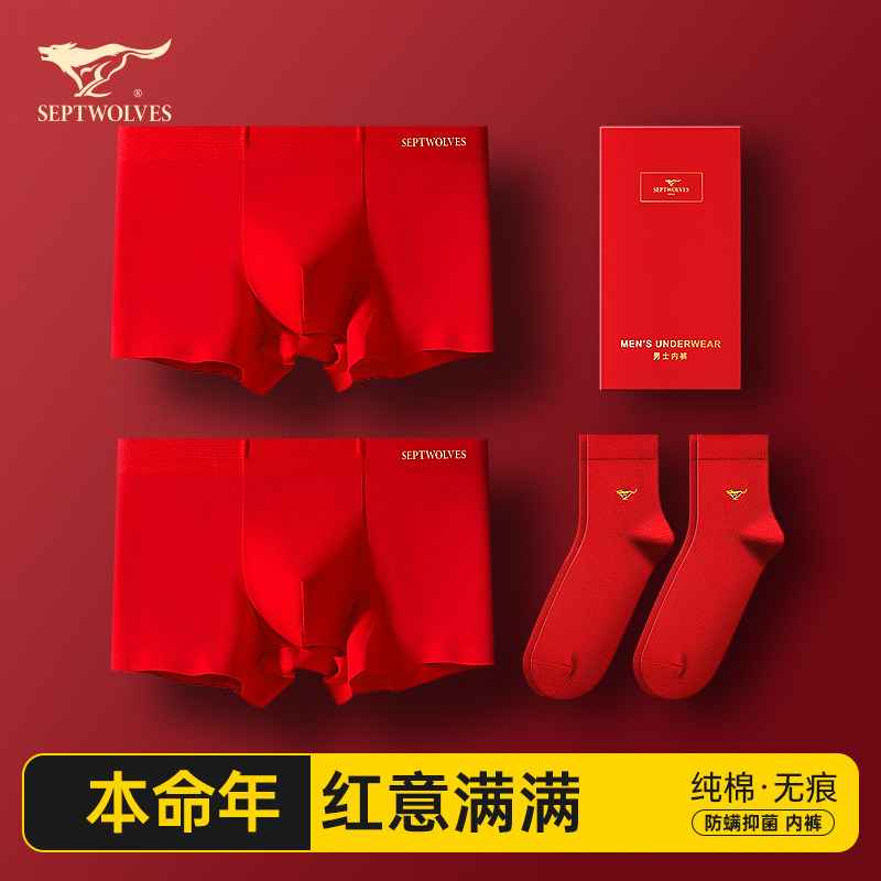 Seven Wolves Year of the Horse Natal Year Gift Men's Panties Socks Cotton Boxer Shorts Big Red Cotton Boxers