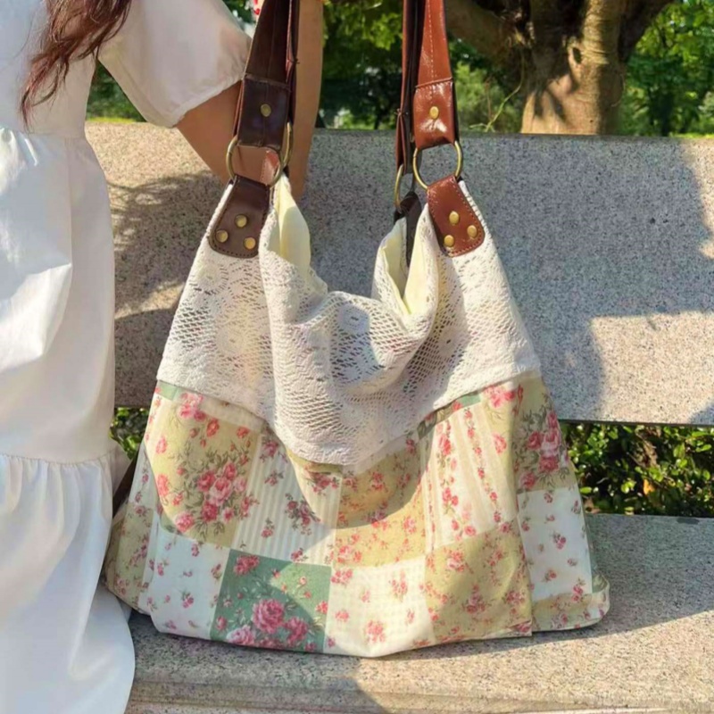 Forest vintage lace floral plaid patchwork cloth bag 2025 new casual versatile one-shoulder portable commuter bag