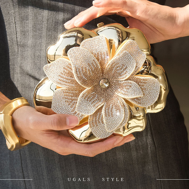 UGALS French Gold Shiny Water Diamond Heavy Flower Temperament Versatile Banquet Acrylic Clutch Crossbody Bag