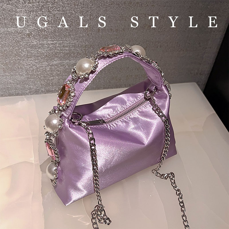 UGALS French Taro Purple Flower Pearl Pillowcase Dinner Party Silk Diamond Bento Bag Clutch Crossbody Bag