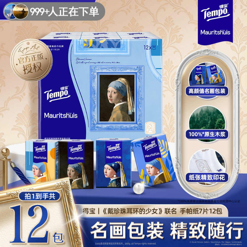 Get. Girl wearing pearl earrings, co-branded art handkerchief paper, 4 layers, 12 packs of Debao unscented packets of napkins