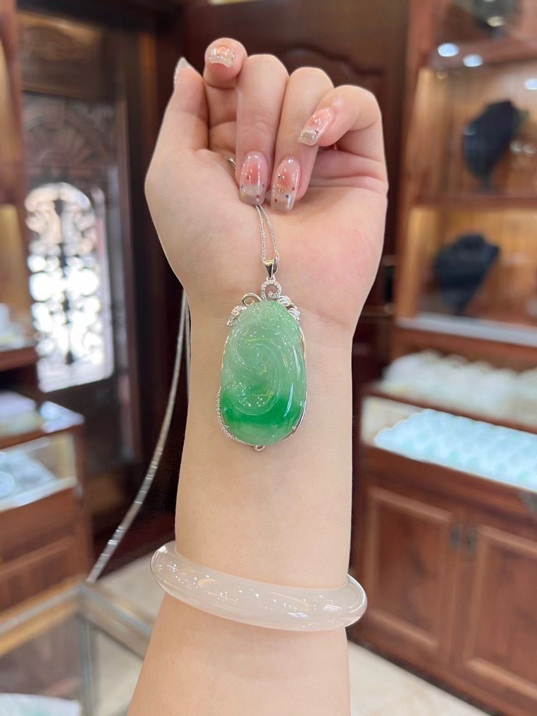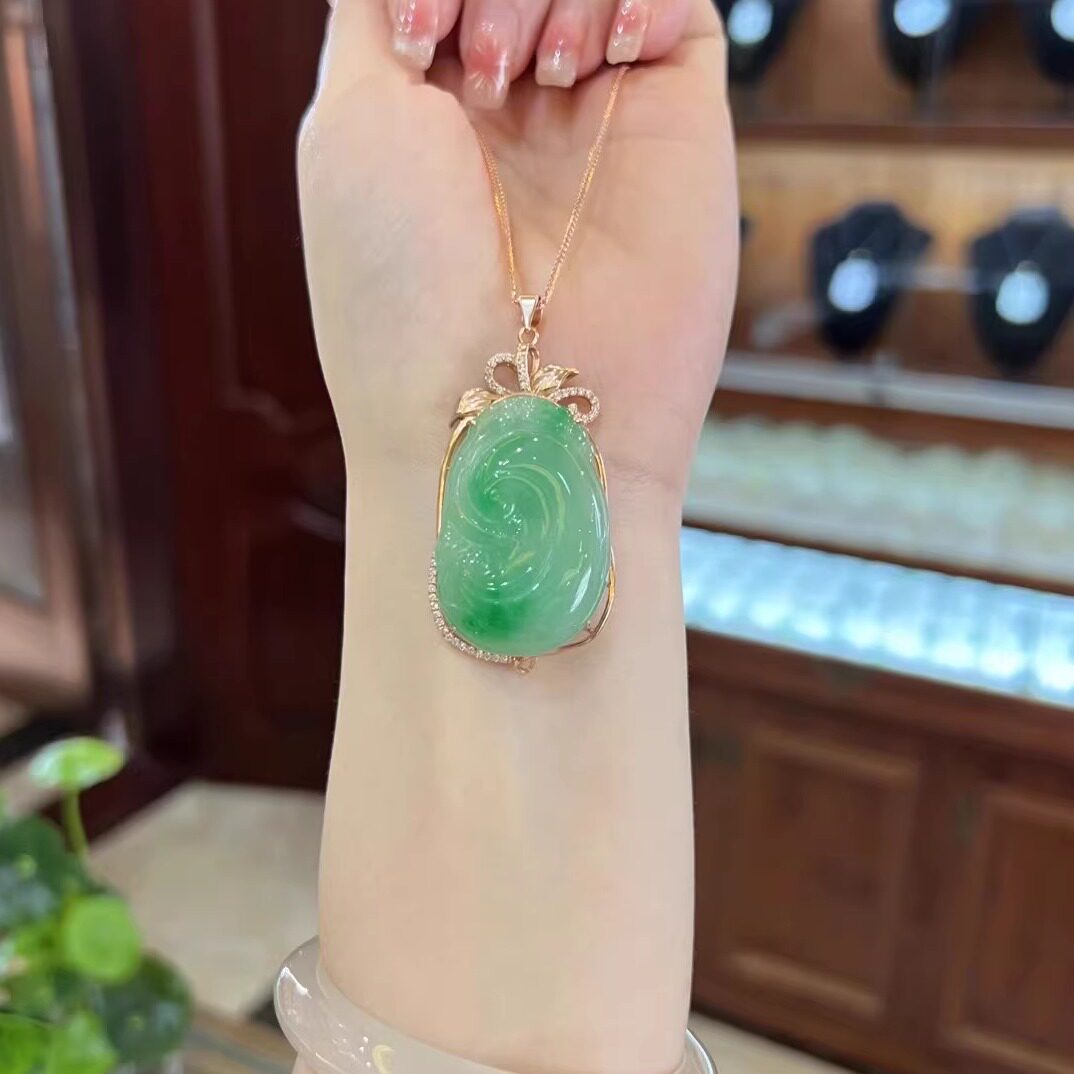 925 sterling silver plated rose gold inlaid with natural A goods Myanmar jade ice glutinous seed green ruyi pendant women's necklace