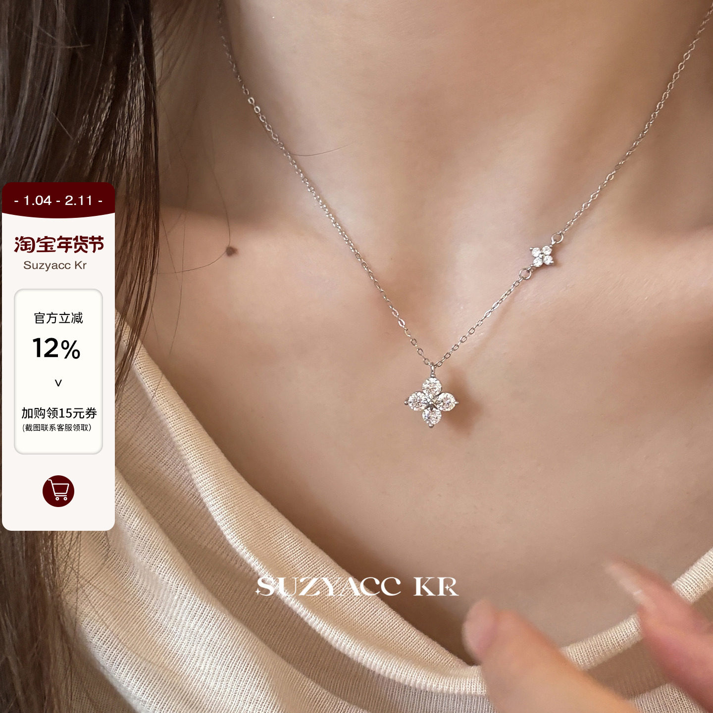 SUZYACC KR 999 Pure Silver Clover Synthetic Zircon Necklace Light Luxury Temperament Premium Sweater Chain Clavicle Chain