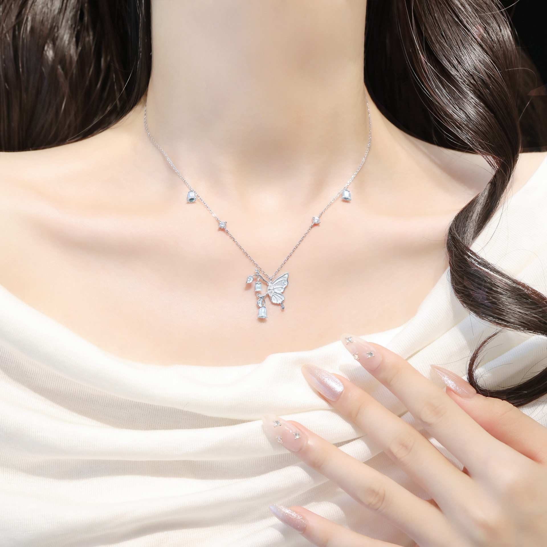 S925 sterling silver cream blue gentle and sweet butterfly lily of the valley flower necklace female niche light luxury jewelry girls gift