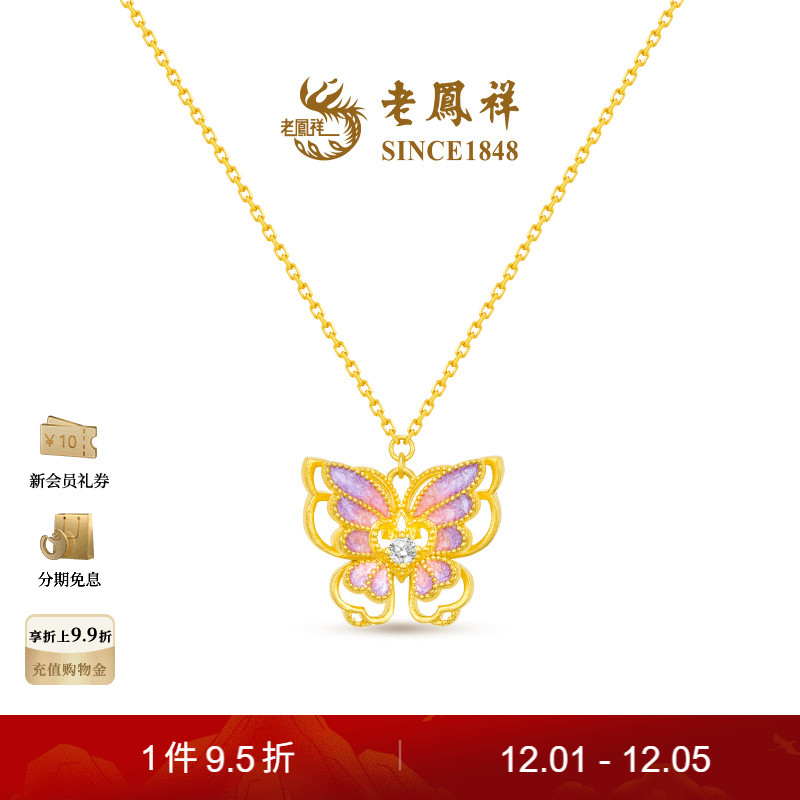 Lao Fengxiang fairy trail butterfly shadow hollow butterfly gilt diamond diamond gold pure gold necklace for girls pricing