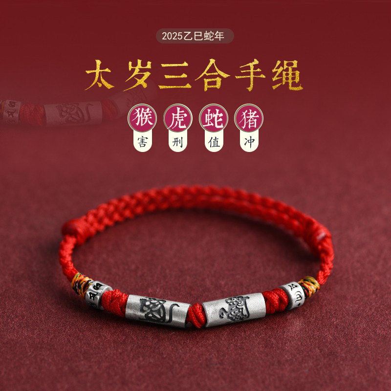Sterling silver zodiac red rope bracelet for men and women, three-in-six in-one, snake, rooster, ox, natal year, hand-woven bracelet