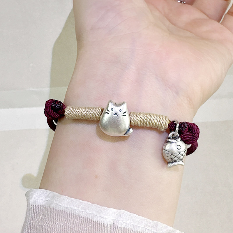 Huaying foot silver 999 sterling silver chinchilla red rope bracelet women's new Chinese small fish beckoning cat niche national style hand jewelry