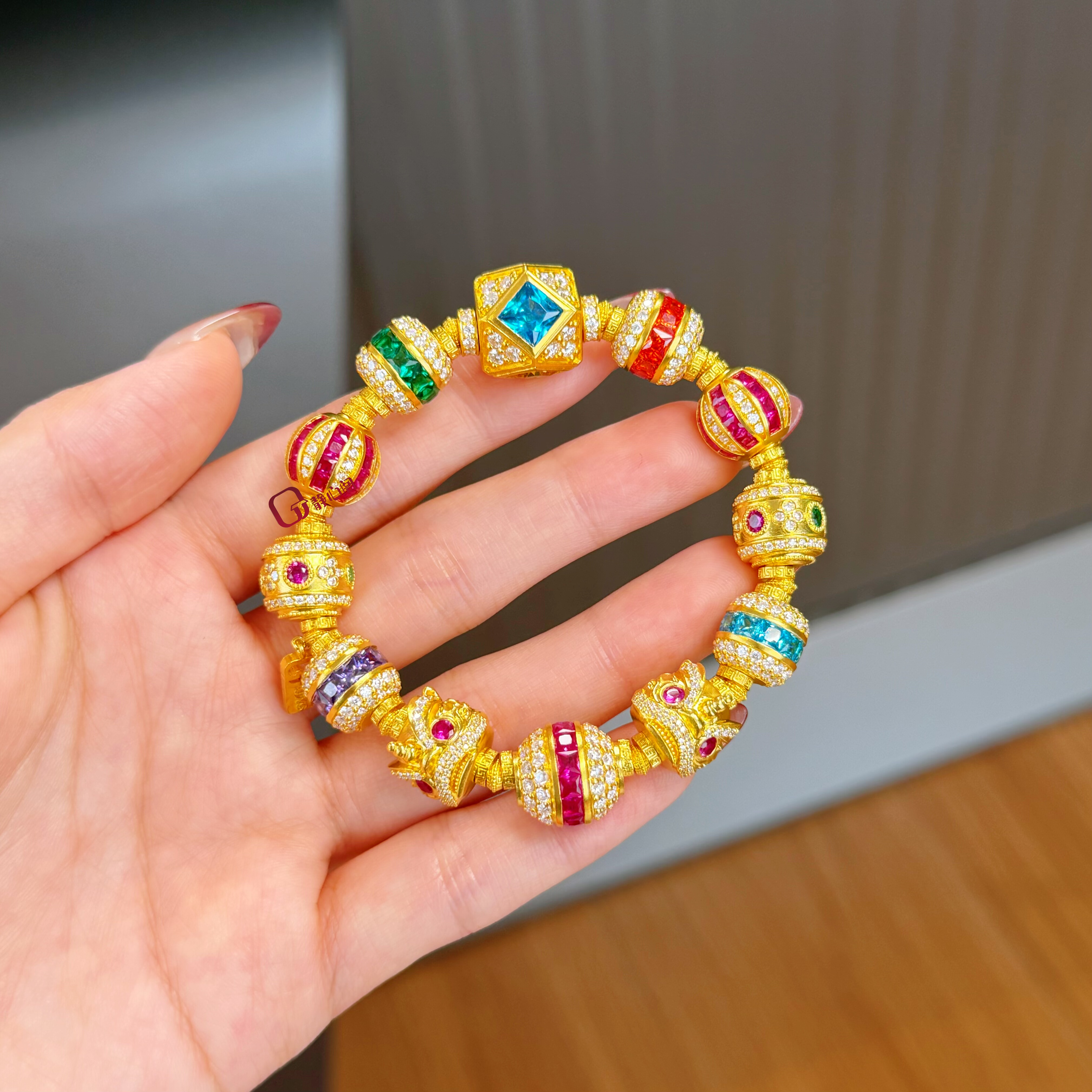 Jingxin Pavilion Jewelry [Big Mac] full diamond bracelet original design ancient method pure gold dot diamond colored stone gold bracelet