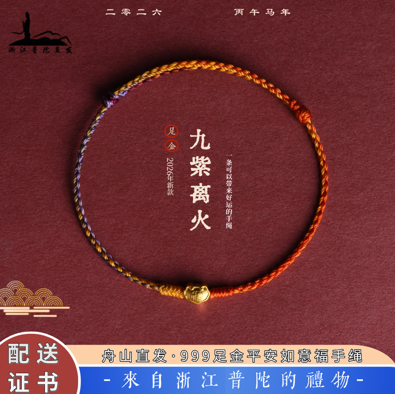 Putuo Mountain Cultural and Creative Collection, 999 Gold Peace Lock, Nine Purple Flame Horse, Natal Year, Red Rope Bracelet, Men's and Women's Transfer Beads
