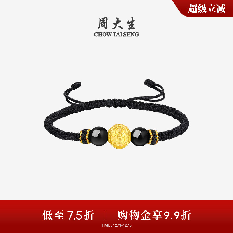 Chow Tai Sheng's gold bracelet foot gold hard gold copper coin Pixiu transfer bead bracelet black rope for boyfriend Christmas gift