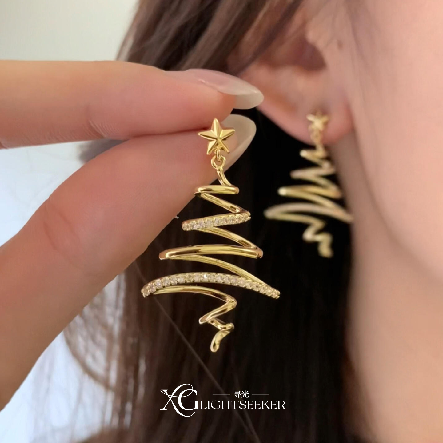 Gold Pop Christmas Tree Pentagram Stud Earrings Christmas Exaggerated Earrings Niche Design Autumn and Winter Giant Beautiful Earrings