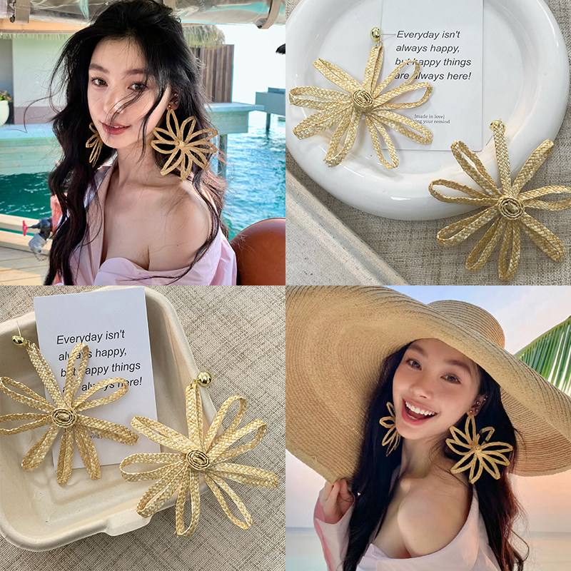 Island vacation! Yi Mengling's same straw flower earrings women's exaggerated earrings resort style seaside accessories stud earrings