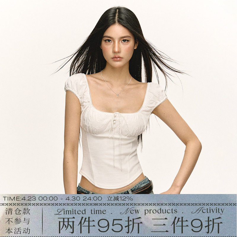 Ariseism American Spice Girl slim design square neck short sleeve T-shirt women's summer cropped puff sleeve top