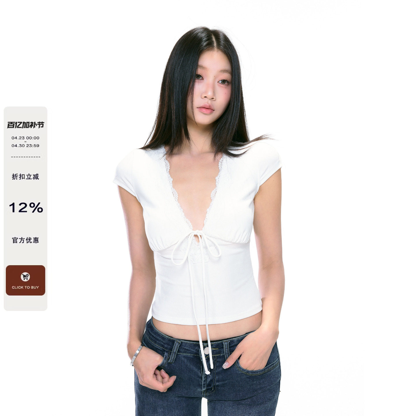 Milky blue V-neck shoulder T-shirt, summer slim slimming top, spring and autumn underwear, short and versatile short-sleeved women