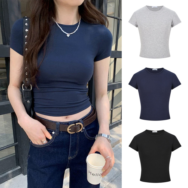 MosesQueen stretchy slim short-sleeved T-shirt women's summer basic small solid color top