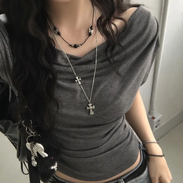 Summer Notes Draped pleated off-the-shoulder short-sleeved T-shirt Sweet and cool hot girl slim slim waist versatile top