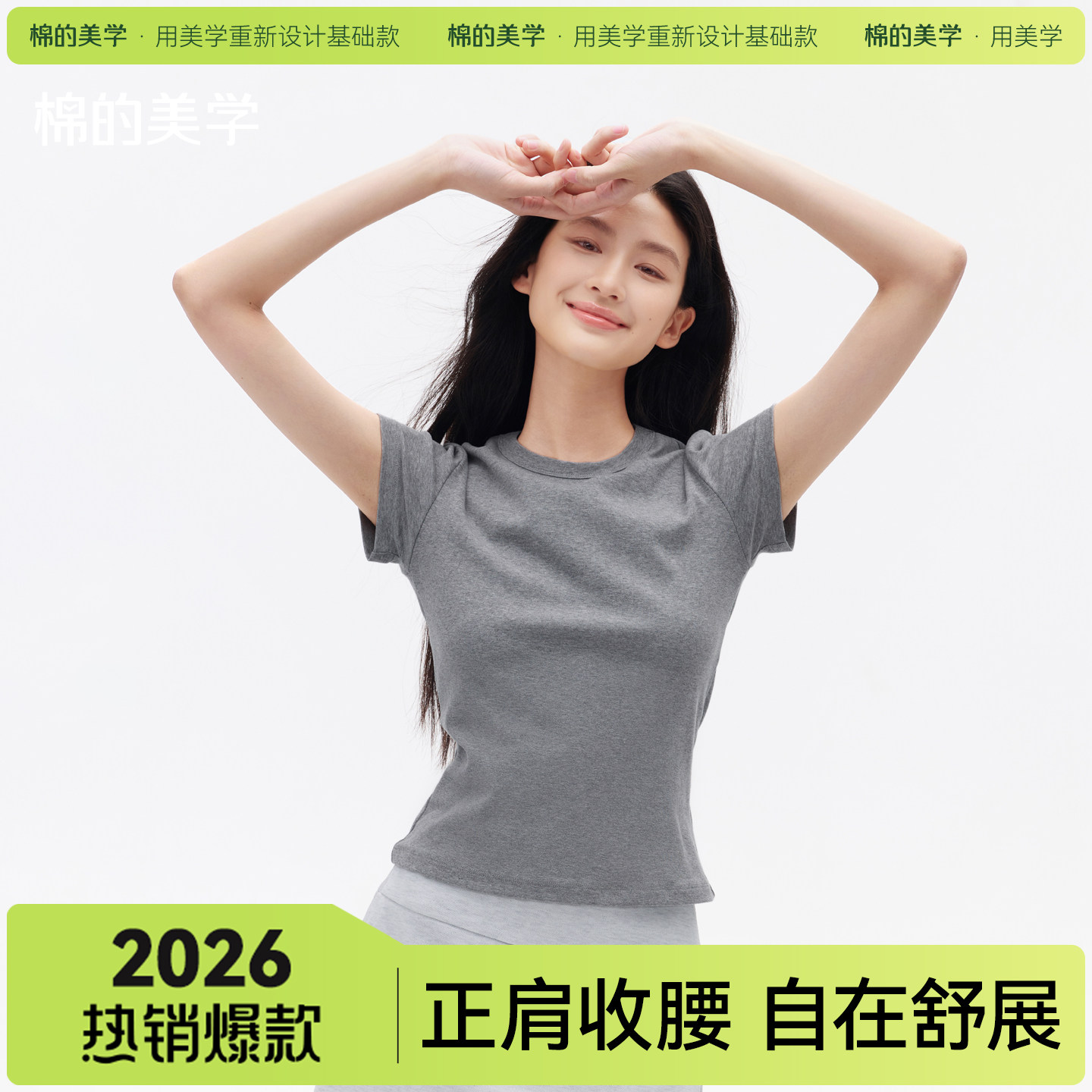 "Cotton aesthetics" design sense Straight shoulder short-sleeved T-shirt women's spring and summer new slim slimming hot girl crew neck top