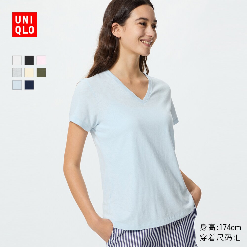 Uniqlo Women's Slub Yarn V-Neck T-Shirt/Short Sleeve 26 Spring Summer New 483460