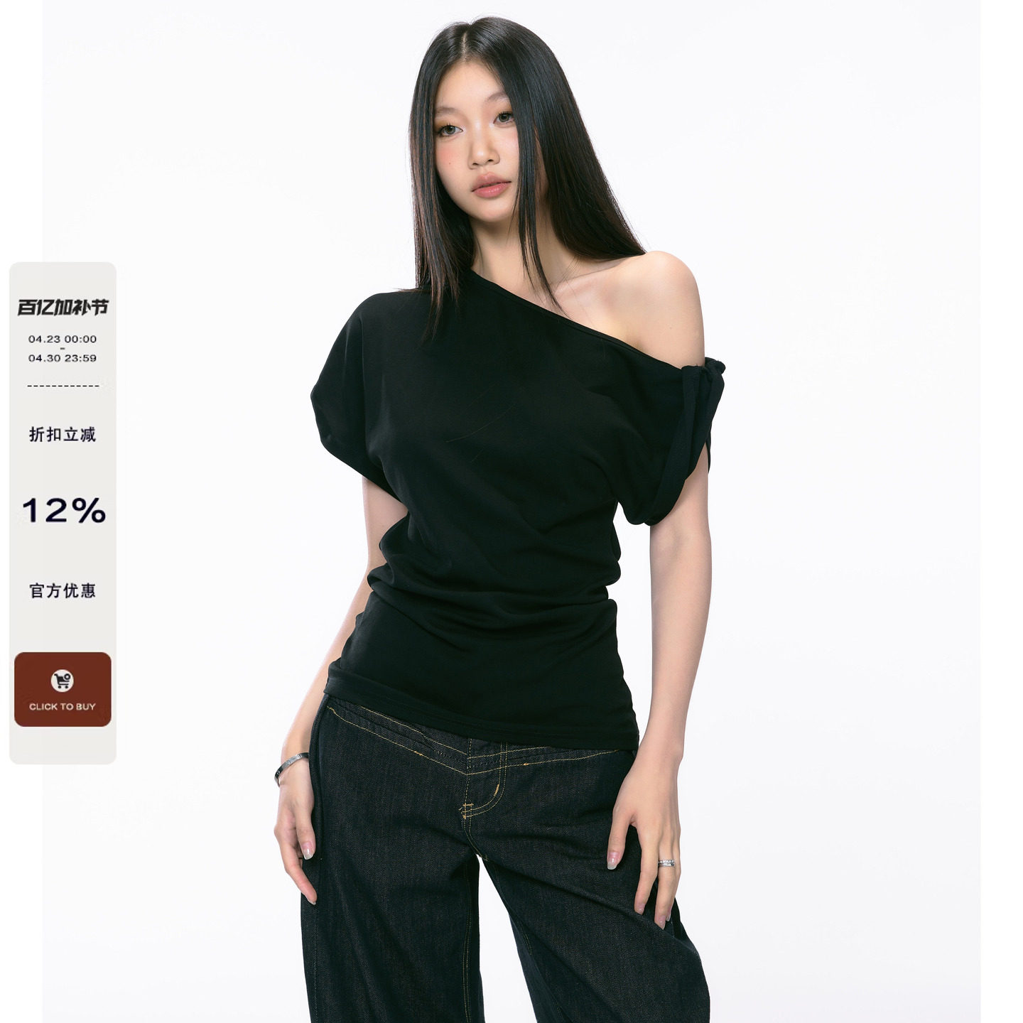 WITHMIN Slanted shoulder top off-the-shoulder sexy pure desire gal black t-shirt women's short sleeves summer beautiful pinching waist women's clothing