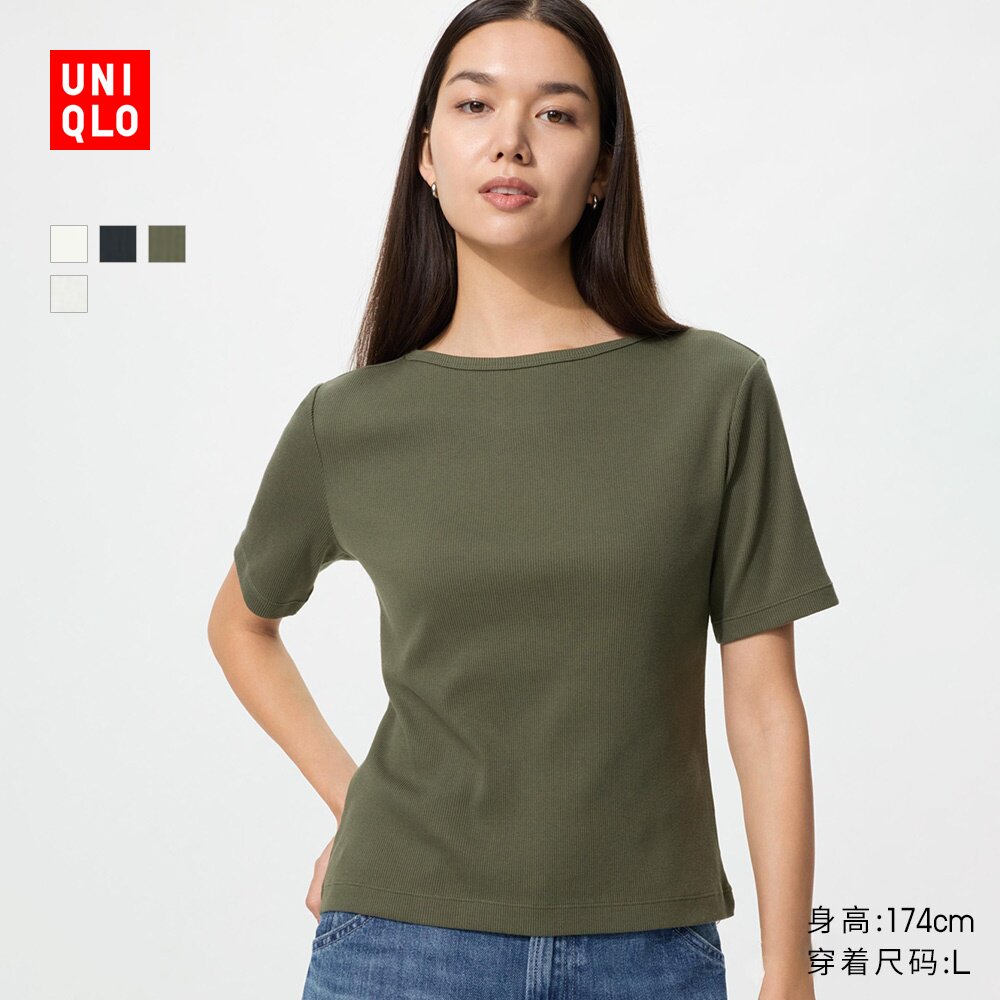 Uniqlo Women's Ribbed Boat Neck T-Shirt/Five-Quarter Sleeve 26 Spring/Summer New 483467