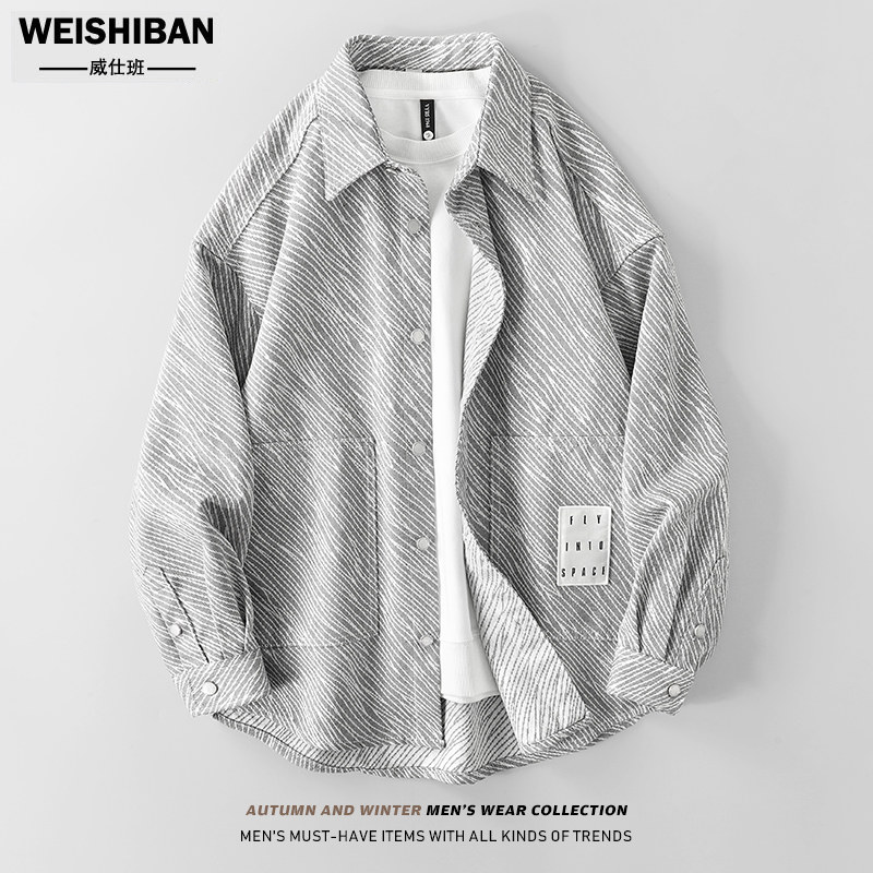 MINISO blue and white striped shirt men's autumn long sleeves fleece Oxford spinning inner bottom shirt jacket winter Y