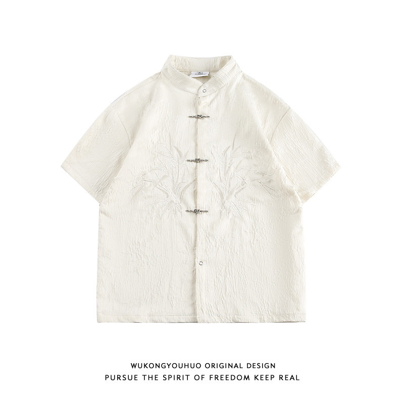 Wukong has in stock, new Chinese embroidered airplane buttons, short-sleeved shirts, men's and women's Chinese style retro tunics, casual shirts