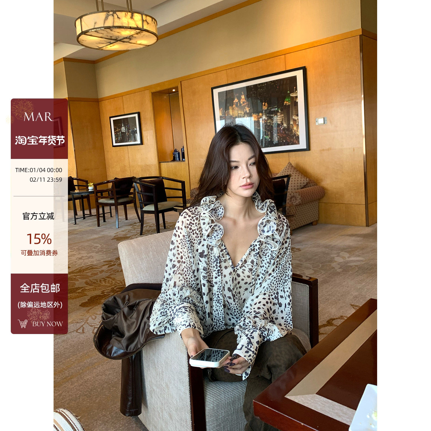 Mar MAR French vintage handmade pleated three-dimensional ruffled leopard print streamer shirt women's new long-sleeved shirt