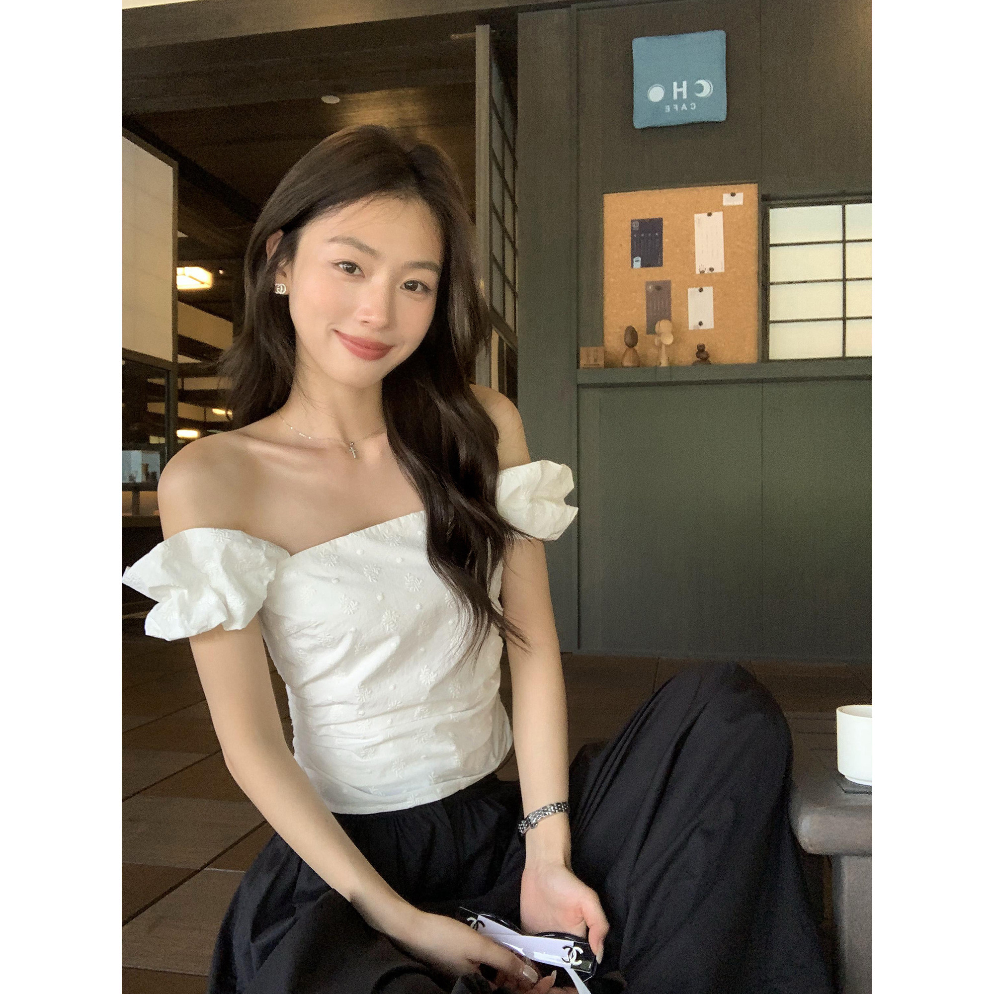 pusumede chic shirt white one-shoulder bud shirt women's design sense pinched waist short off-the-shoulder top