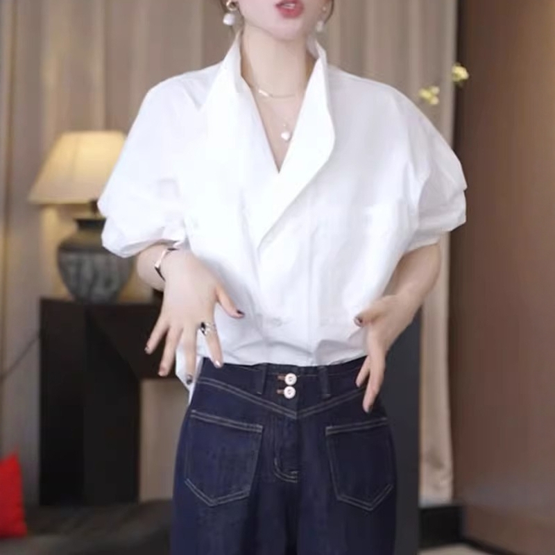 Large size design pure cotton white short-sleeved shirt women's pre-autumn new fat MM slimming casual versatile lapel top
