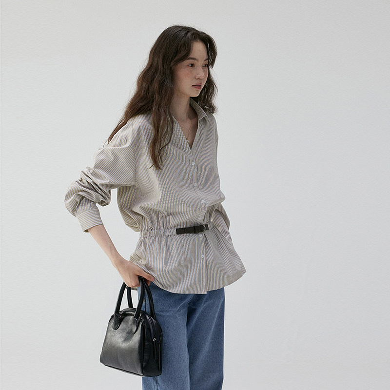 "Wasabi Pie VOOE" design V-neck waist striped loose shirt women's new autumn temperament commuter top
