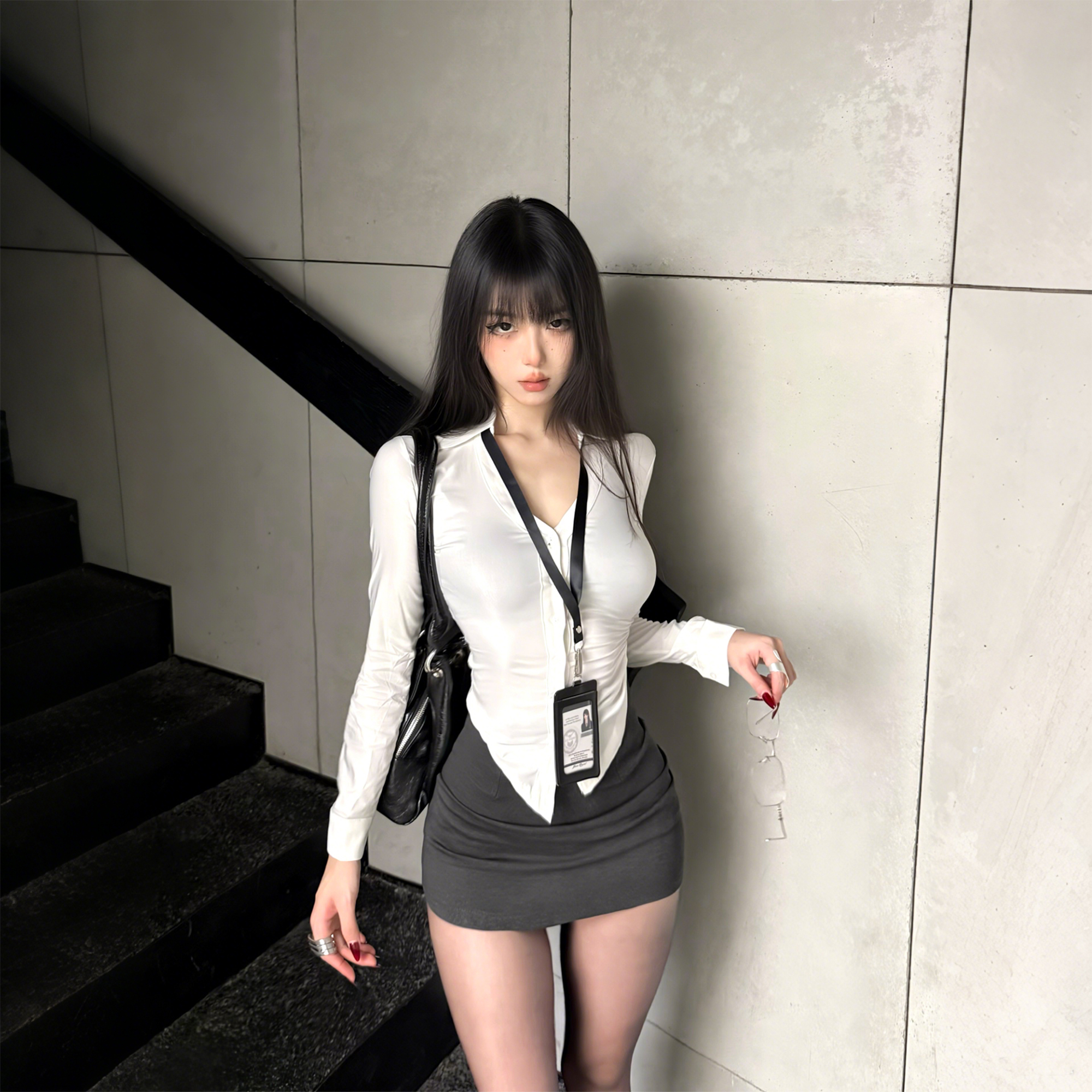 Mars institutejk waist shirt white shirt female polo slim slim long sleeve V-neck top autumn and winter