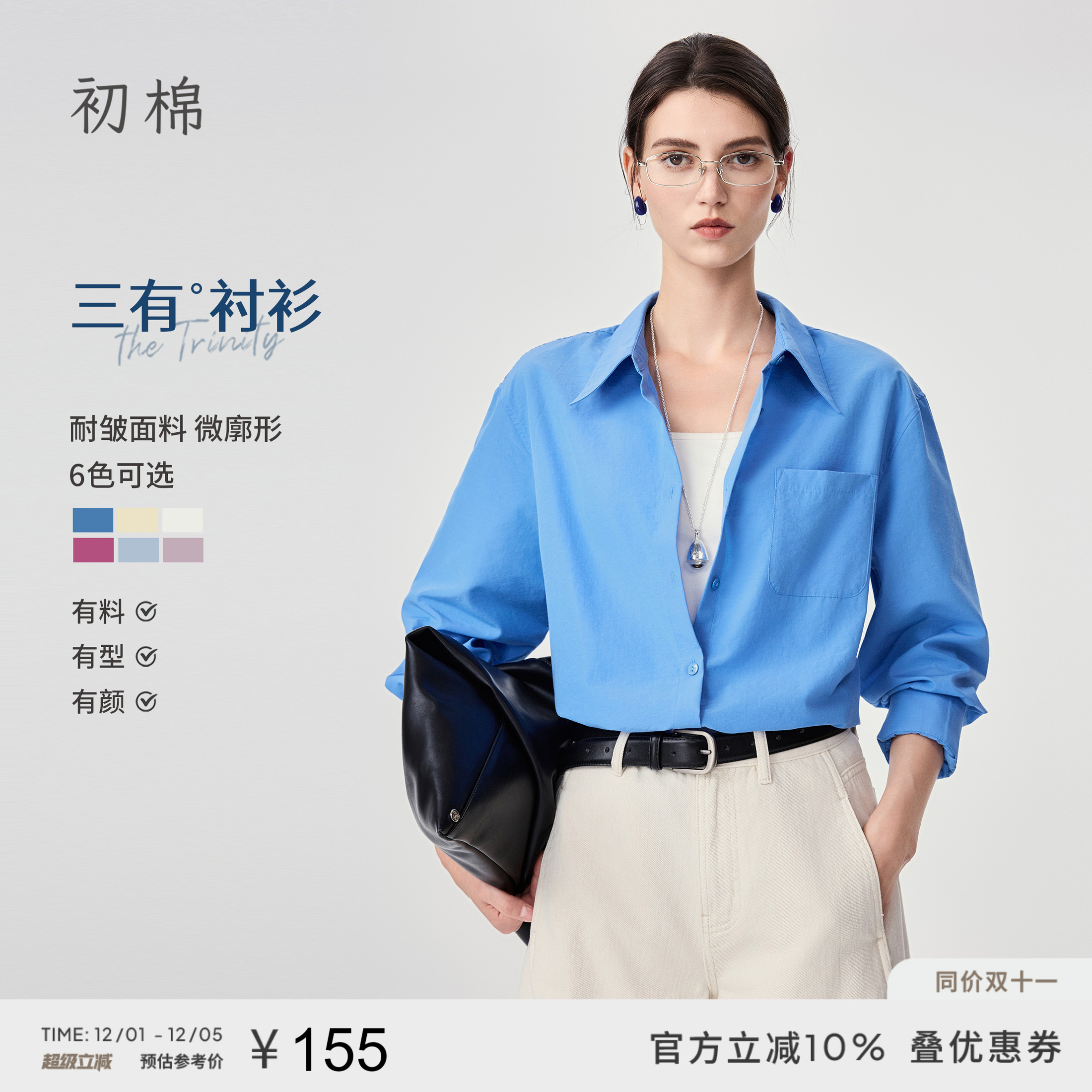 First cotton French pointed collar high-end blue long-sleeved shirt women's autumn and winter slightly loose layered casual shirt is not easy to wrinkle