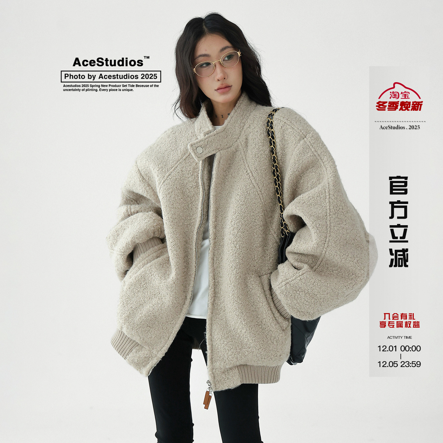 AceStudios Premium Padded Stand Collar Fleece Jacket American Vintage Loose Silhouette Padded Jacket