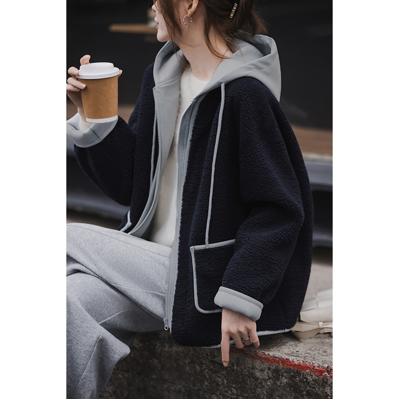 Small grain Irish coat contrasting color imitation lambswool top women's winter new casual versatile hooded fake two pieces