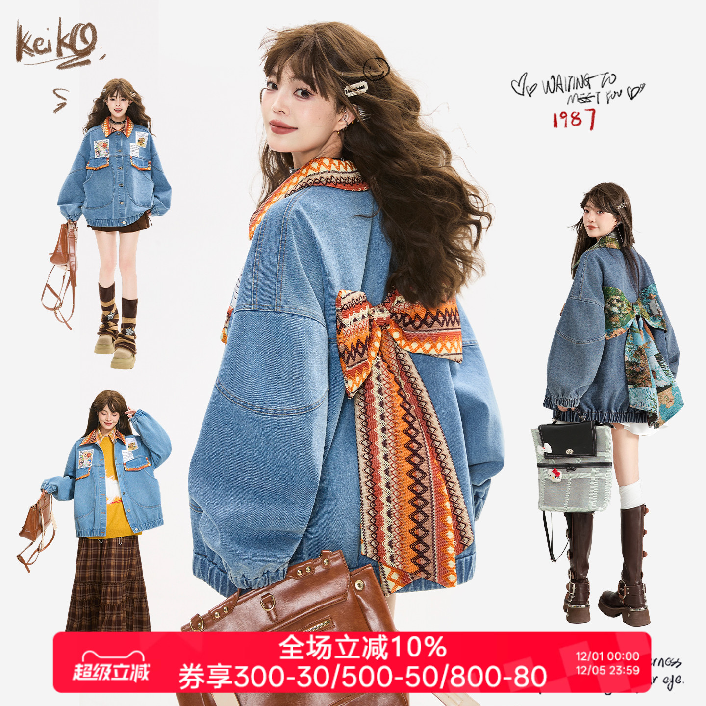 KEIKO Youthful Woven Flower Bow Denim Jacket Fall Winter New Huge Silhouette Padded Jacket