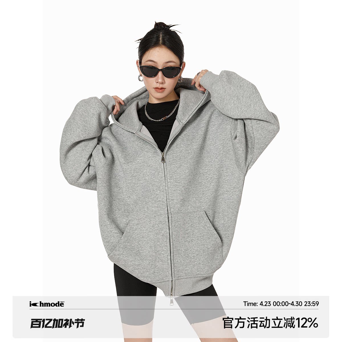 ICH MODE American Heavy Gray Sweatshirt Jacket Women's Spring New Loose Hooded Zipper Cardigan Top
