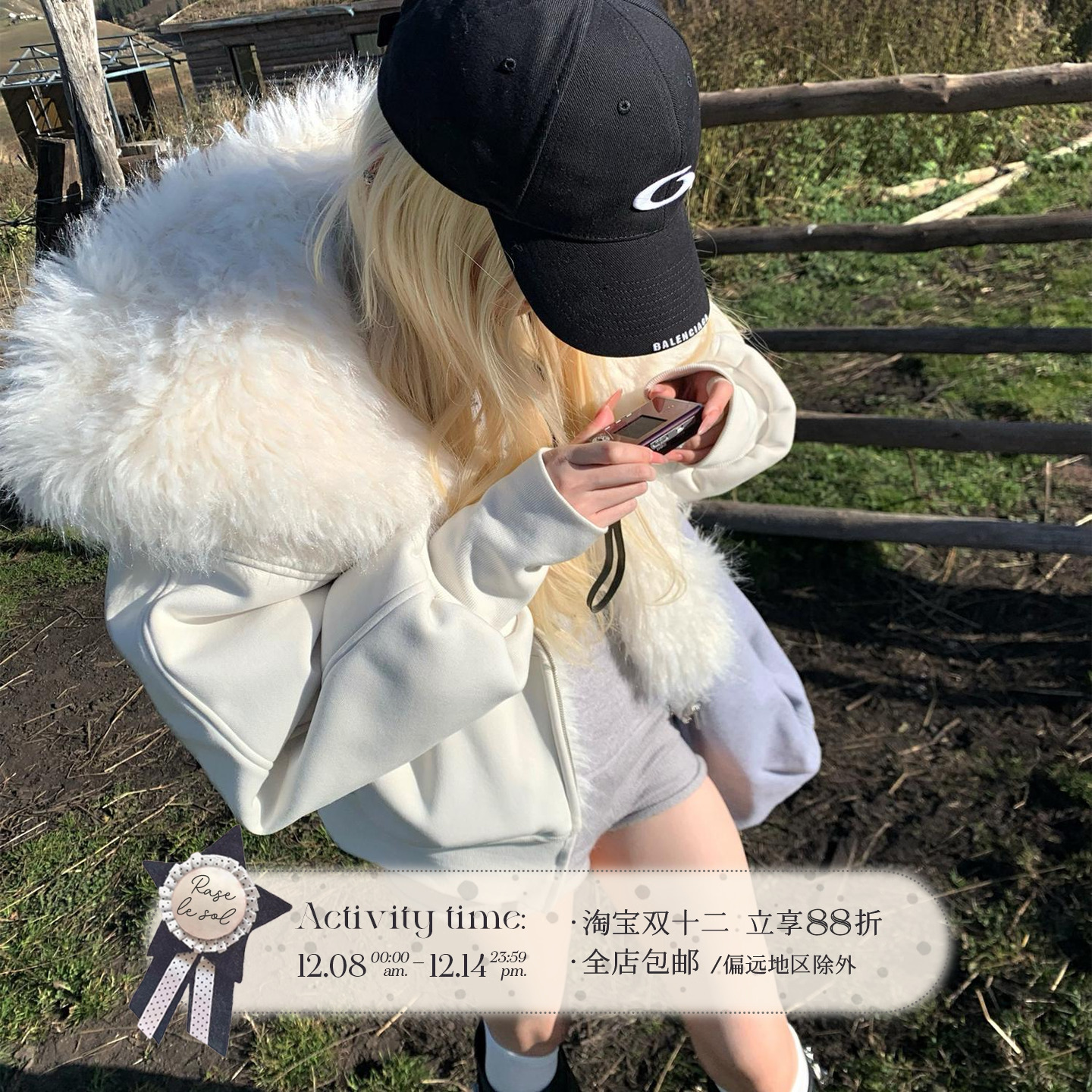 Rase le sol 'Love of Fate' white fur collar with fleece cropped hooded thickened sweatshirt jacket