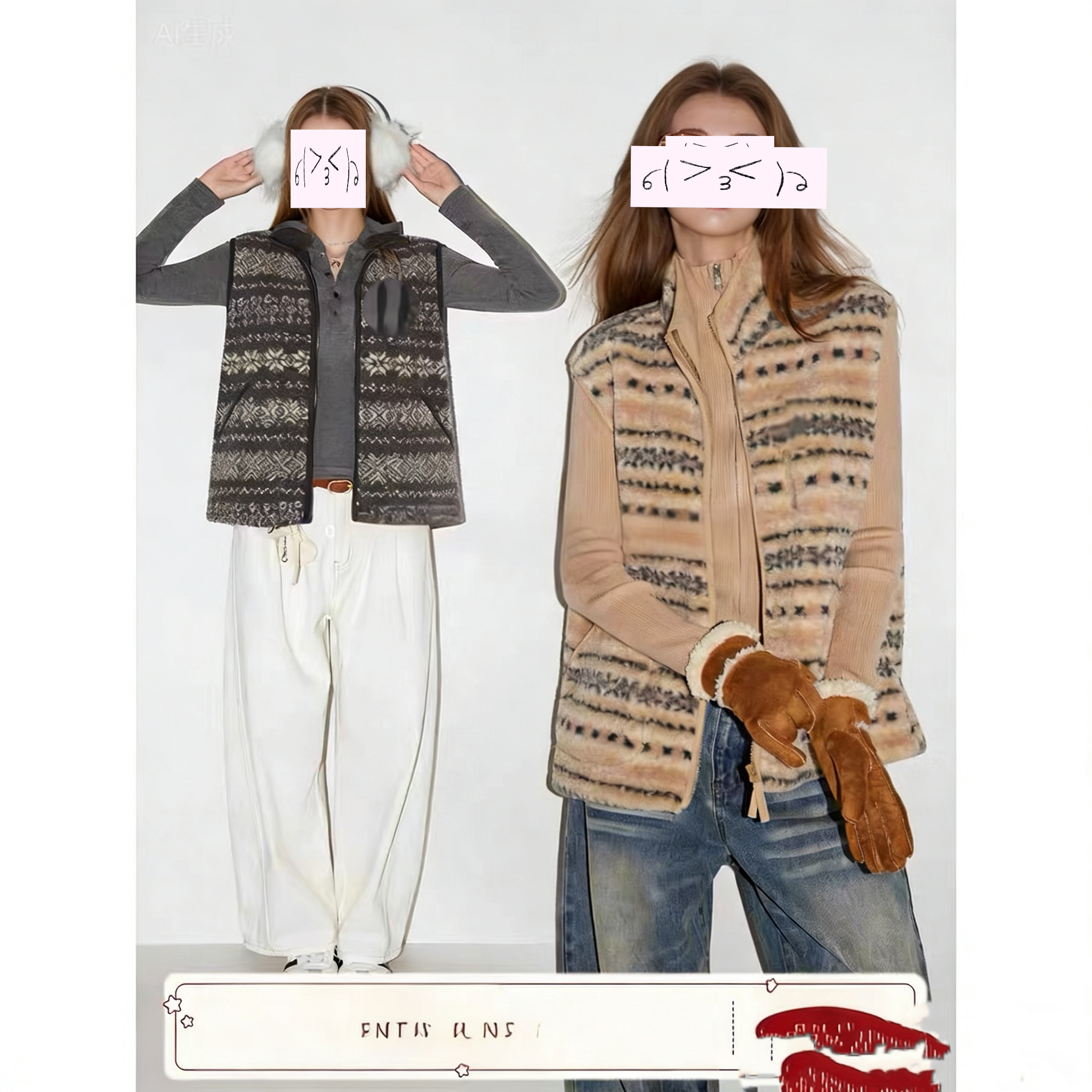 MoodBerry American Vintage Fair Island Patterned Fleece Vest Women's Fall and Winter Lazy Casual Stand Collar Layered Vest