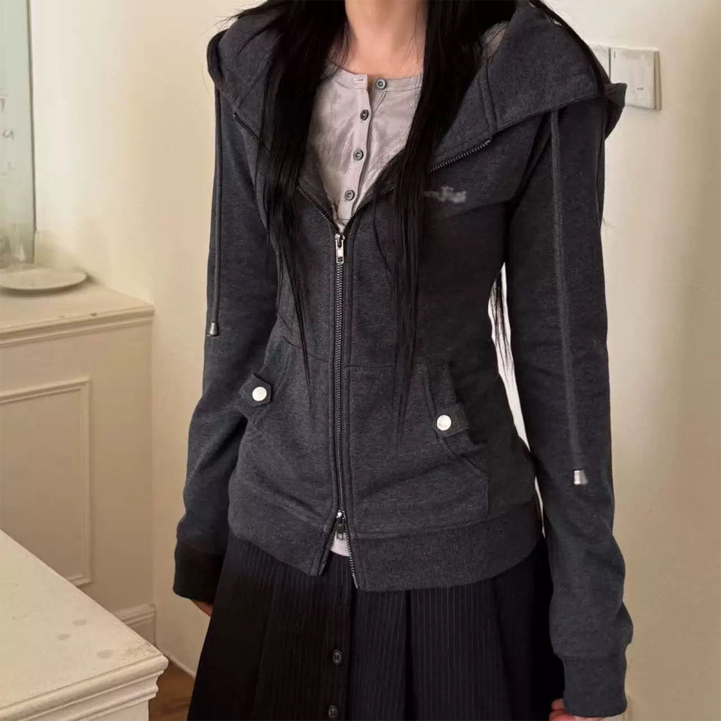 Korean retro hooded sweatshirt jacket women's autumn and winter new Yabi ancient commuting waist slim cardigan top