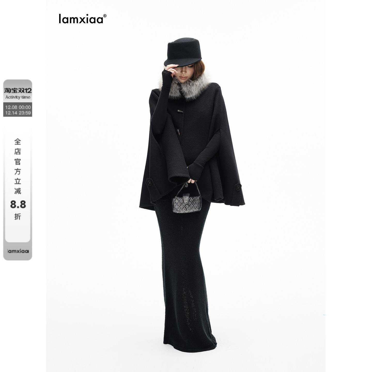 iamxiaa* wool handmade dweed stand-up collar eco-friendly fur collar ripped sleeves horn buckle loose cape coat