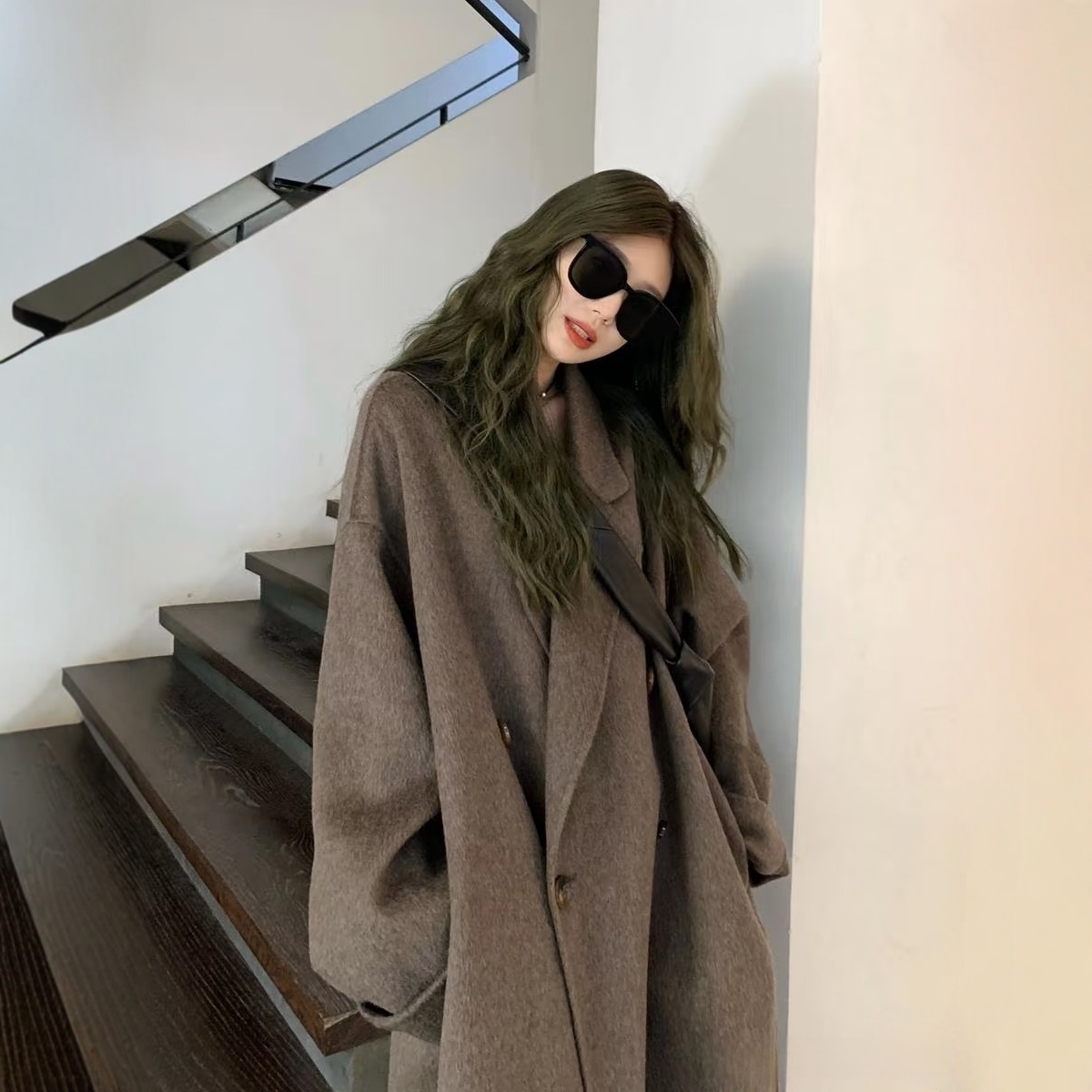 Mocha brown reversible cashmere coat women's mid-length lazy style 2025 new Korean loose wool wool jacket