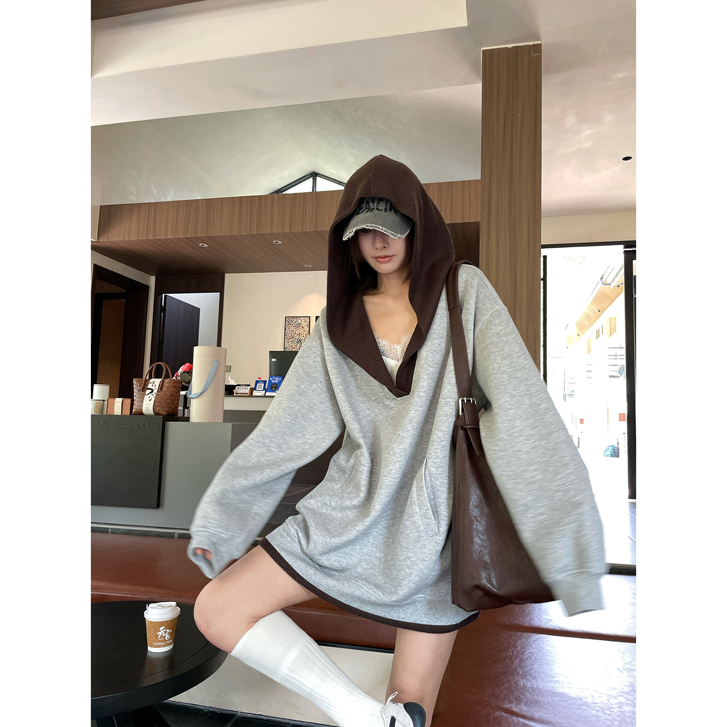 JCCC Shadow [Gray Coffee Shadow] Versatile gray V-neck knitted splicing fake two-piece hooded pullover sweatshirt