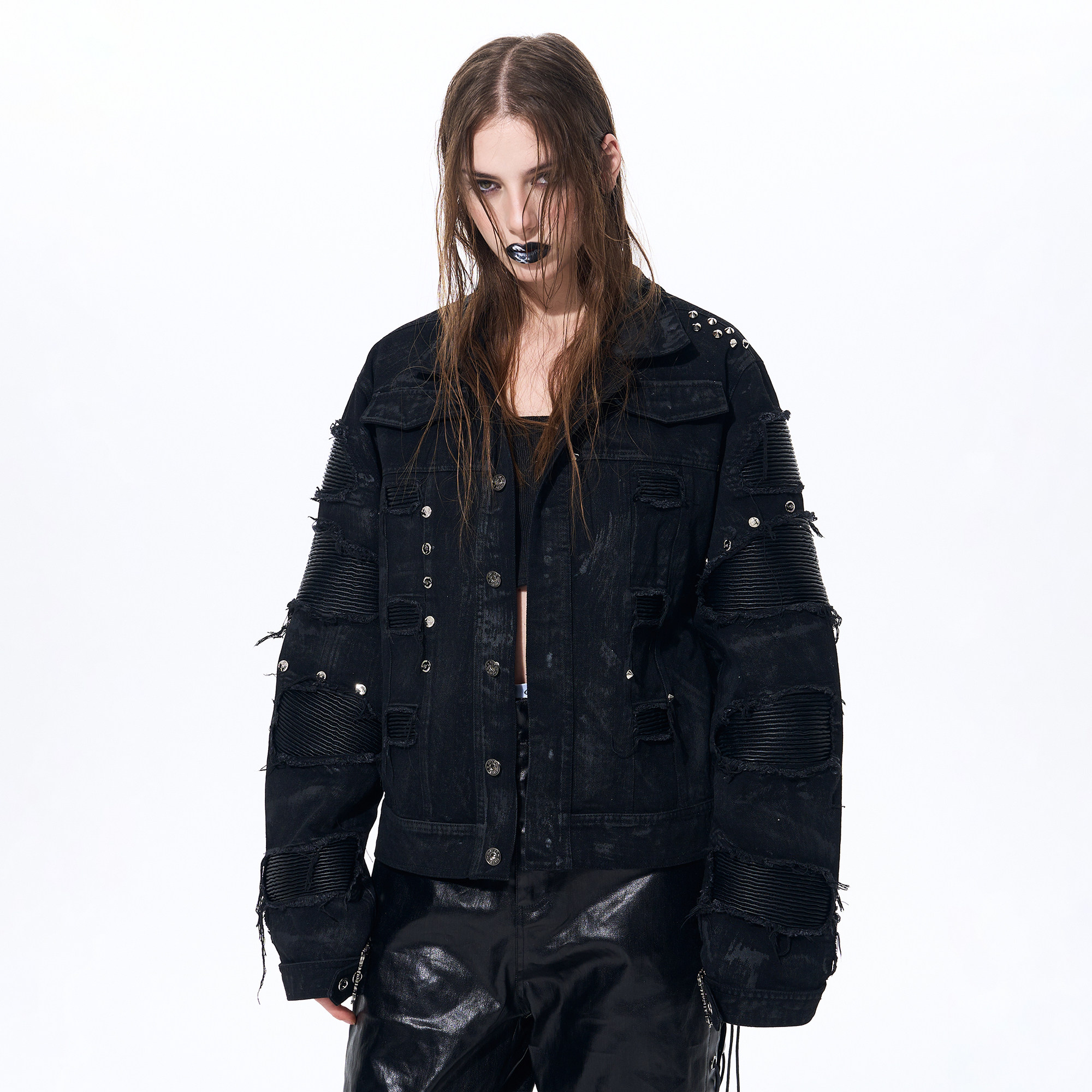 Fourth3ex 26SS Knight Street Vandalism Brushed Wax Denim Jacket Men's Fall Winter Metal Rivet Black Jacket
