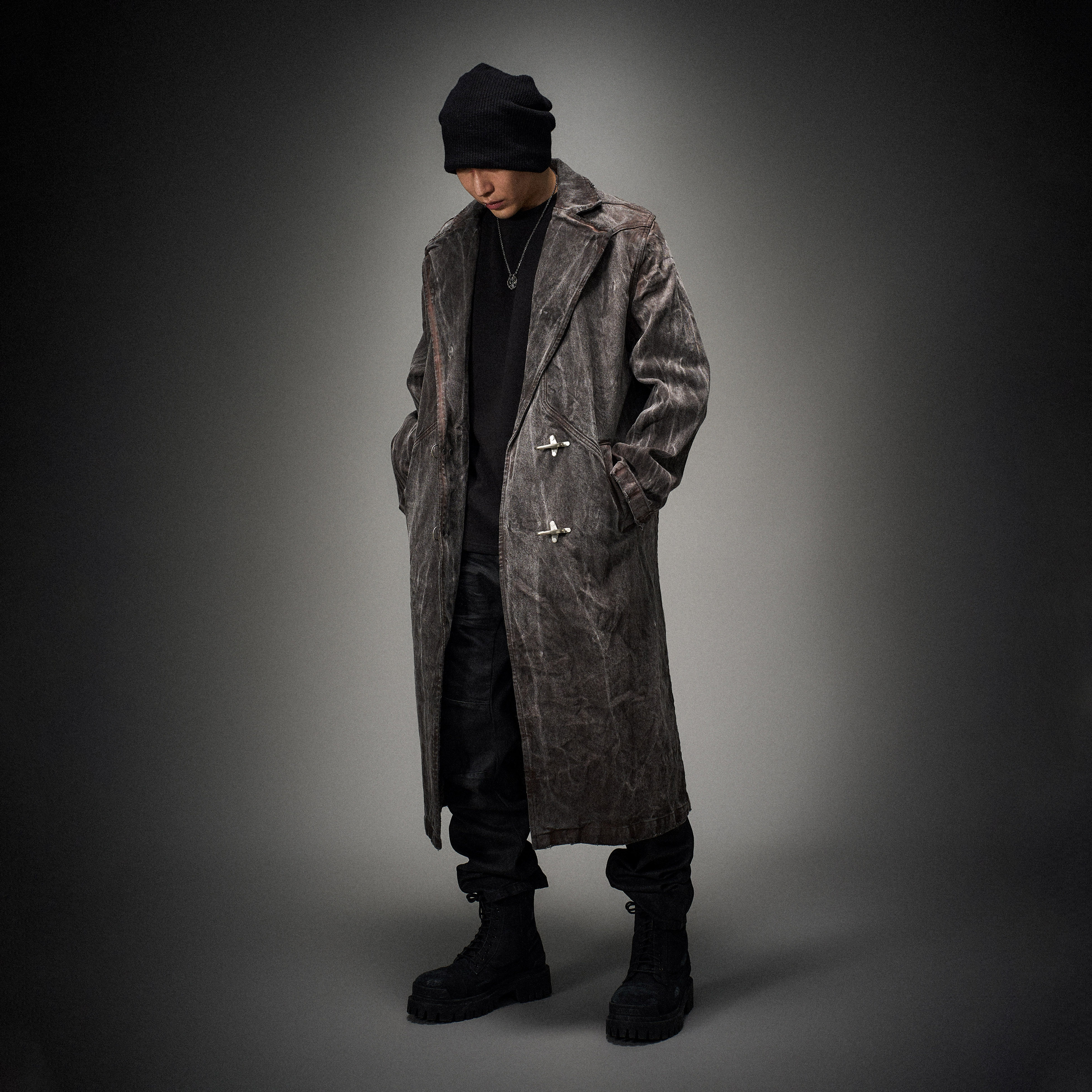 ULD/90s Sea Salt Denim Enzyme Graphite Aged Washed Stand Up Collar Style Denim Jacket Midi Trench Coat