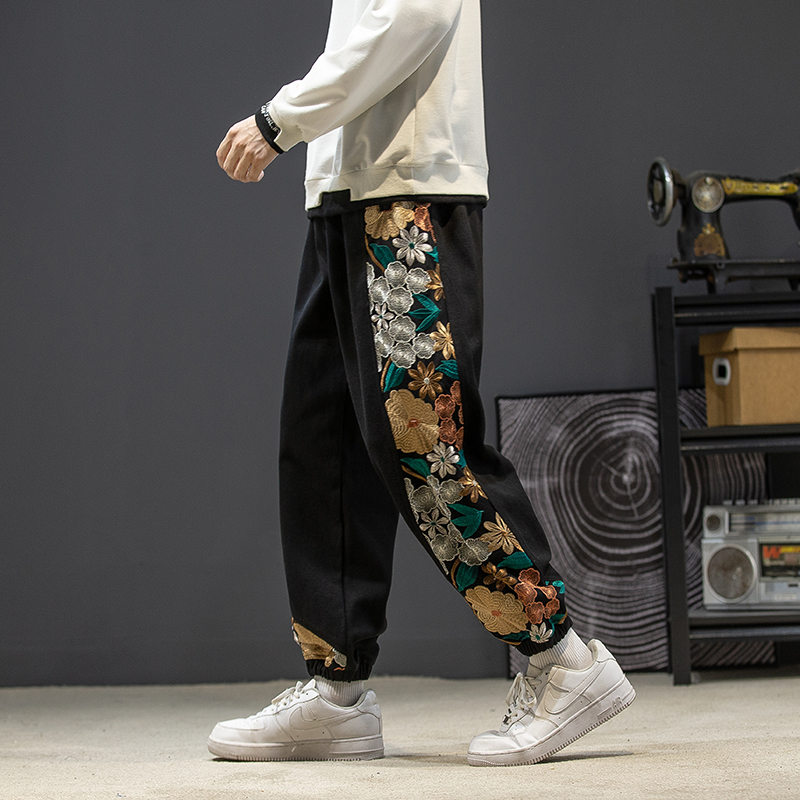 Heavy industry embroidered slacks, men's national style, retro corsets, cropped trousers, national splicing, national tide, fashion spring and autumn