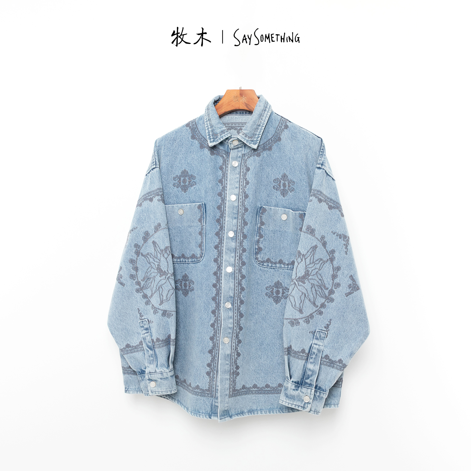 Mumu men's autumn new national tide embroidery men's shirt collar denim jacket men's loose retro literary embroidery