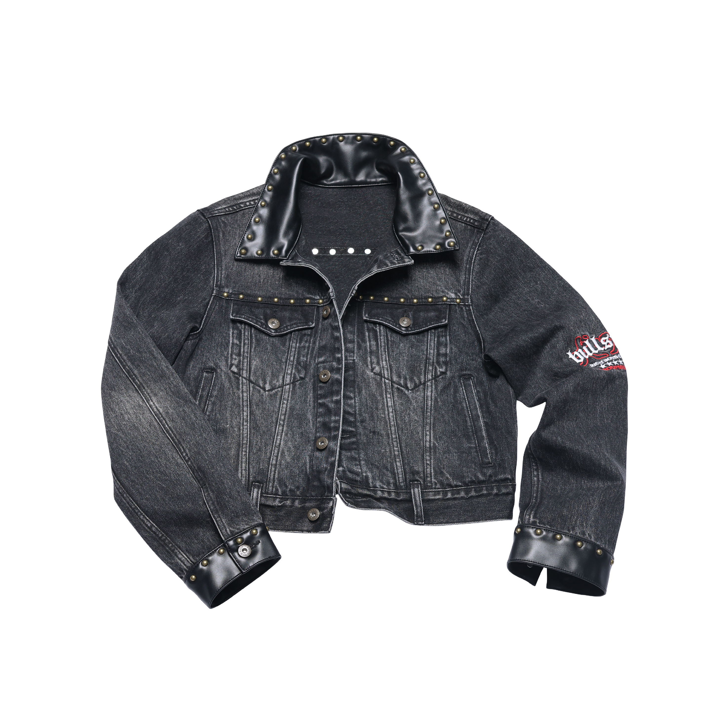 GROUPMAREK[GMK] bullshit black washed embroidered rivet patchwork cropped denim jacket
