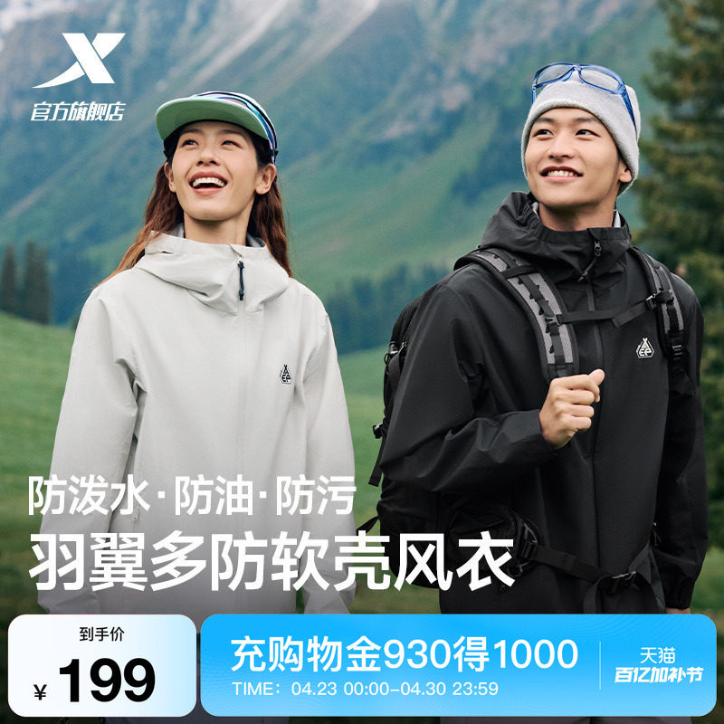 Xtep winged softshell jacket for men and women, outdoor water-repellent fleece jacket, couple mountaineering, windproof hooded charge windbreaker