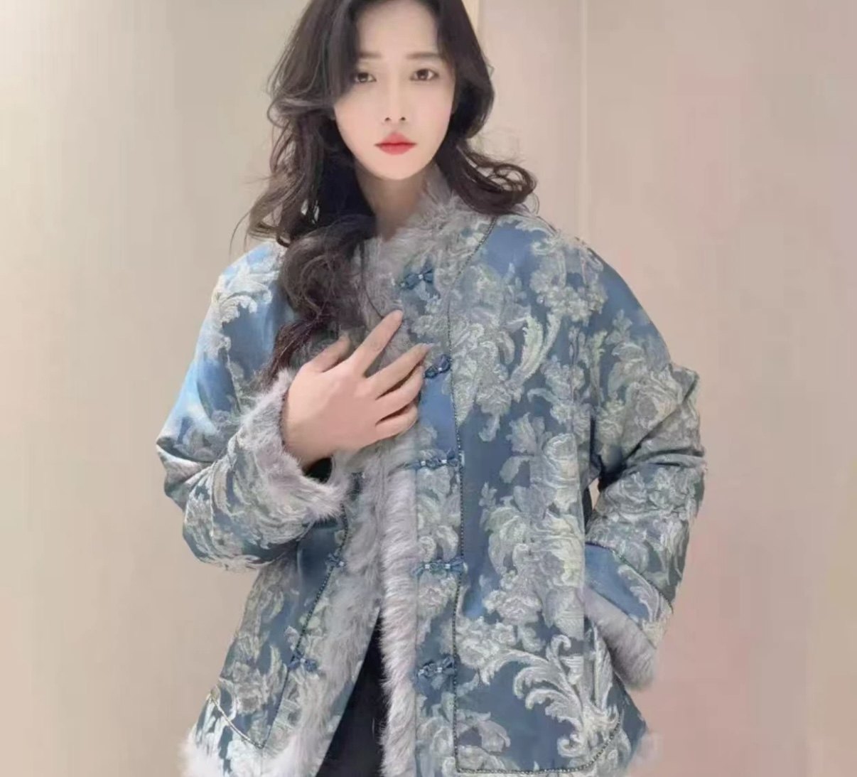 【Blue and White】New Chinese blue and white porcelain rabbit fur winter warm handmade buckle national style handmade handheld warm top