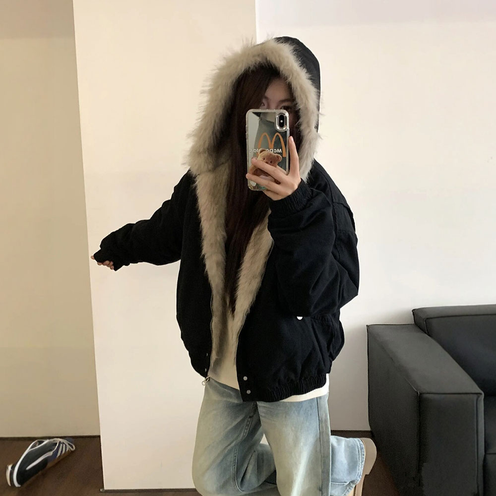 Lamb plush cotton jacket thickened jacket women's winter 2025 new American retro loose hooded cargo cotton clothes trend